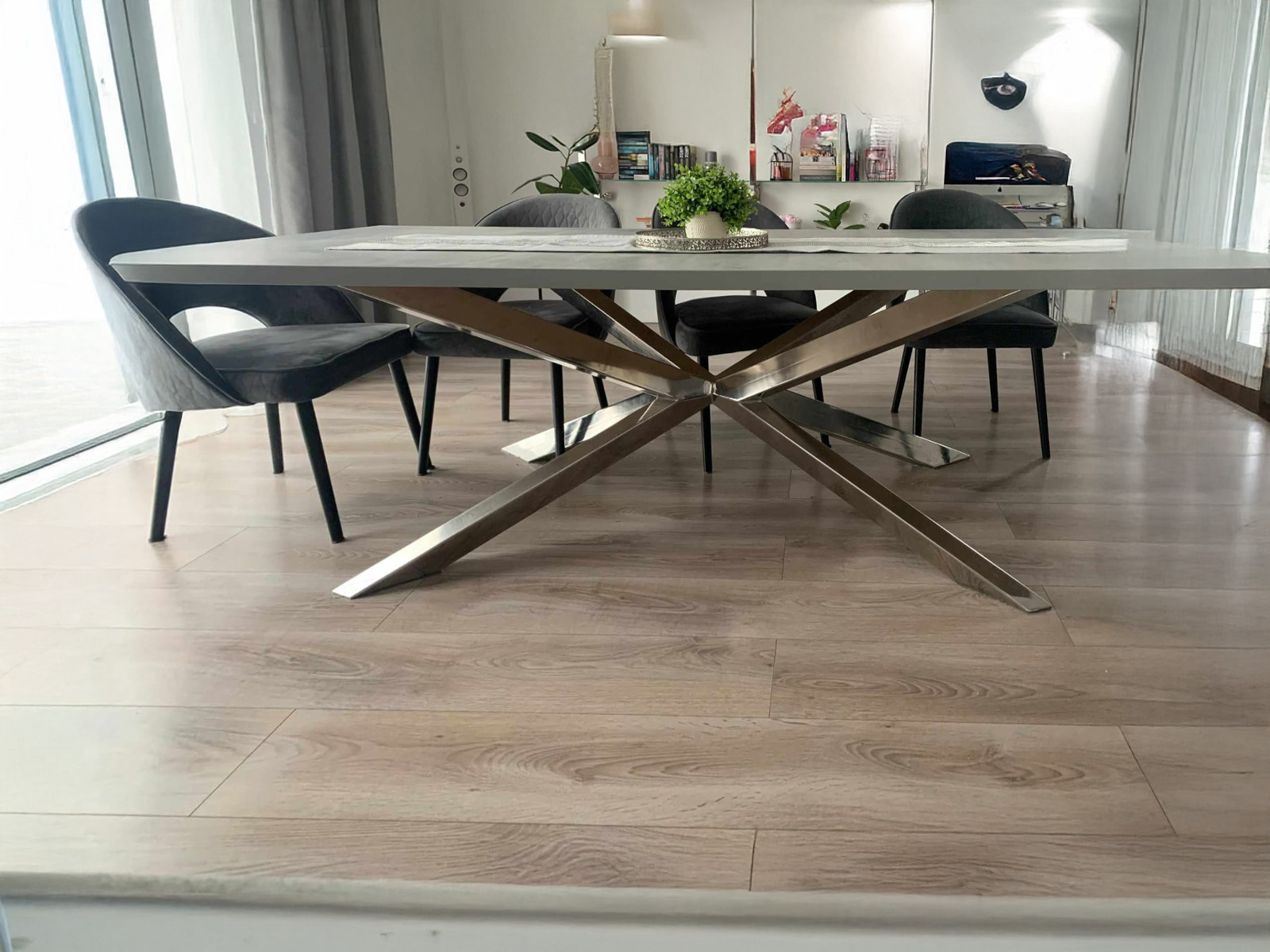 In der Kollektion finden sich auch Loftmöbel mit minimalistischen Designs, wie Regale und Tische, die Stahl und Glas harmonisch kombinieren und so funktionale sowie stilvolle Akzente setzen. Die charakteristischen dunklen Rahmen und geometrischen Formen verleihen den Räumen eine moderne und zugleich gemütliche Ausstrahlung. Ergänzt wird das Gesamtbild durch große, runde Spiegel, die den Raum optisch vergrößern und für mehr Licht und Eleganz sorgen.